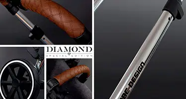 ABC Design is introducing the exclusive Diamond Special Edition. Chrome frame, white-wall tyres, melange fabric and fine leather appliqués are part of the special edition's expressive look. The models Salsa 4 Air, Condor Air, Turbo 4 T and Viper 4 are available.