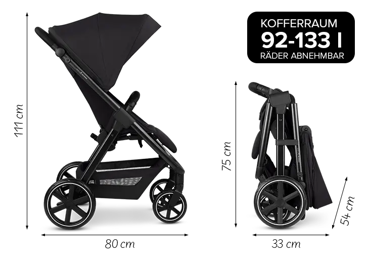The Avus 2 lacks nothing in terms of pushing comfort either: the parking brake is located directly on the right rear wheel. This eliminates the need for a rear axle. This not only saves weight and space, but also gives you more legroom when pushing. A real plus point, especially for tall parents.Thanks to the large front and rear wheels, the Avus 2 is impressive both in the city and on easy terrain. Supported by the pushchairs' integrated suspension, the wheels ensure a smooth ride on any surface.