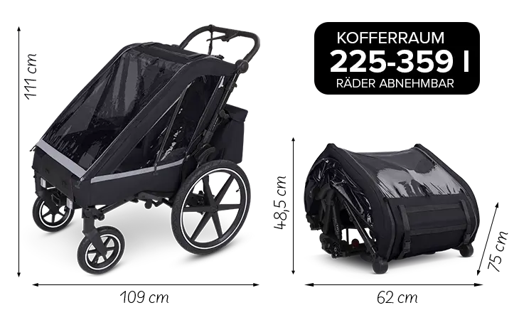 For adventures not right on your doorstep or for a vacation trip, pack your Tour 2 into the car. The two foldable front wheels, which can also be removed if necessary, and the extra-compact folding function allow you to easily transport it even in a small trunk with limited storage space. This means that no adventure is too far away. The fact that the foldable front wheels do not have to be stored separately, e.g., in the trunk, has another advantage: if they are anything but clean after a trip, the dirt stays in place thanks to the folding mechanism. At the same time, the Tour 2 is even lighter than its predecessor. Weighing only 23.7 kg, it is easy for moms and dads to load.
