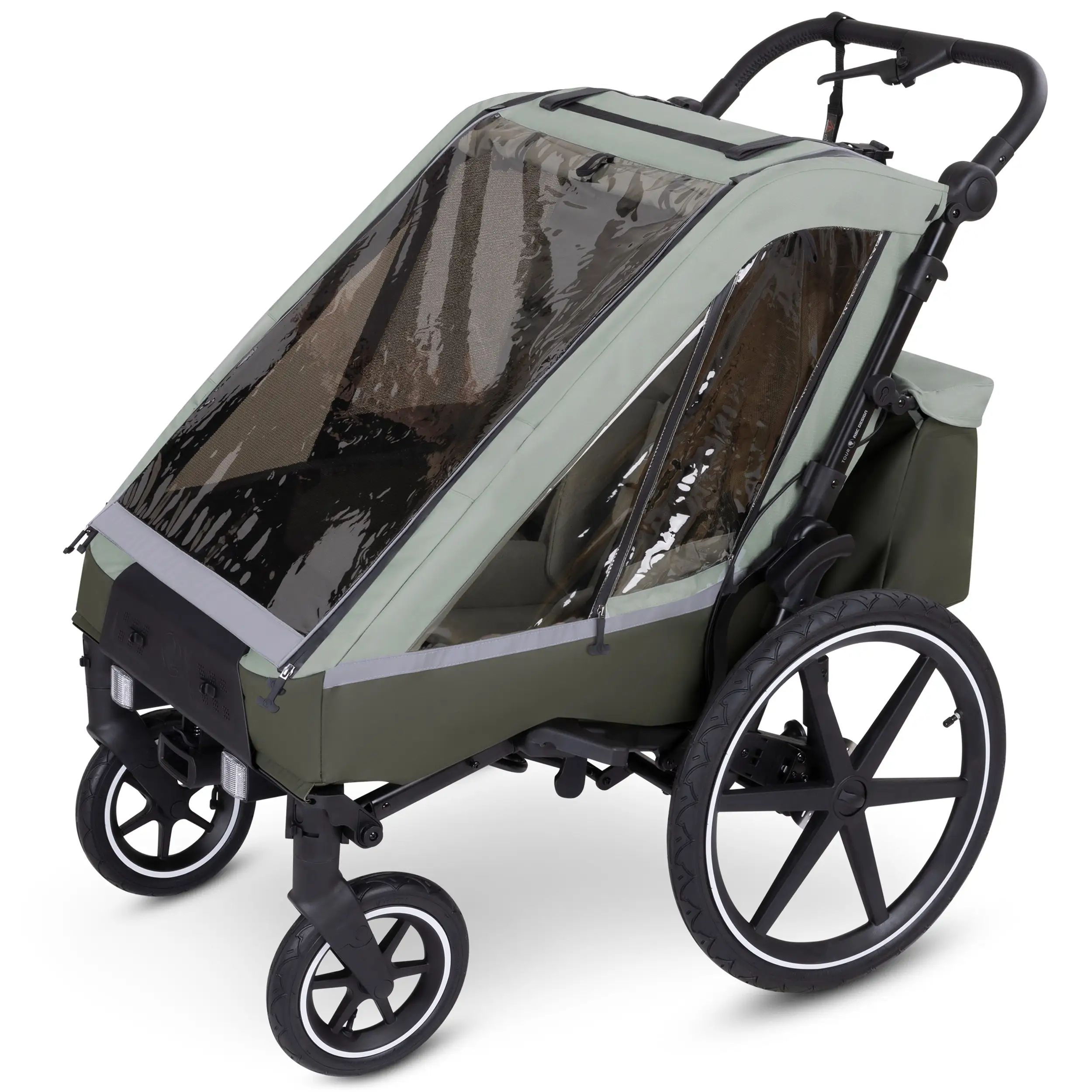 - Integrated 3-in-1 canopy that reliably protects your children from the elements with mosquito net, rain and splash protection, adjustable UPF 50+ sun canopy